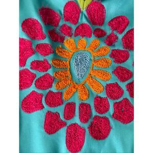 Vibrant and beautifully detailed Gretchen Scott “Midori” embroidered dress in turquoise with multicolor floral embroidery.