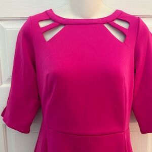 Vibrant fuchsia midi dress with stylish cutout neckline. Perfect for any event.