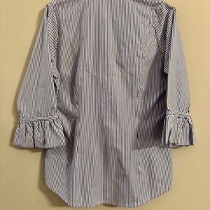 New with tags, never worn, Gretchen Scott cotton/poly blend blouse with ¾ length sleeves with ruffled cuffs. A modern update to a classic striped button-down, designed to be worn tucked or untucked.
