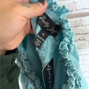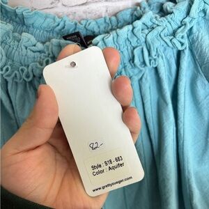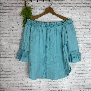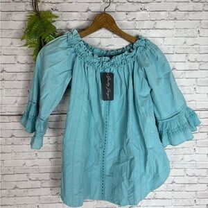 NWT Gretty Zueger Aquifer Light Blue Ruffle Neckline Off Shoulder Blouse
