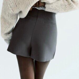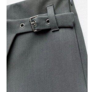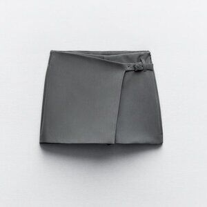 NEW Gray mini skort featuring fake welt pockets at the back, matching fabric layered wrap detail, tabs with metal buckles and concealed side zipper.
