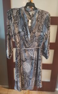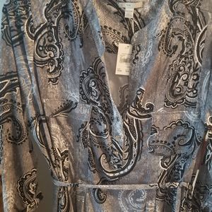 Wow, check out this grey and black paisley shirtdress! Classic styling never goes out of style. Wear with tall boots, heels or chunky shoes to create a new look. The dress features 3/4 sleeves, self belt and knee length with silver button placket. Size 18/20.