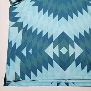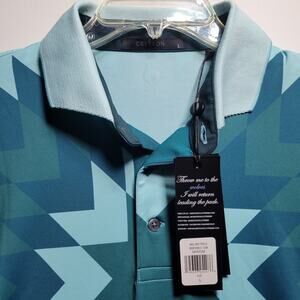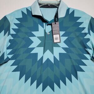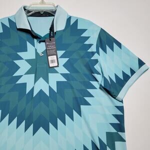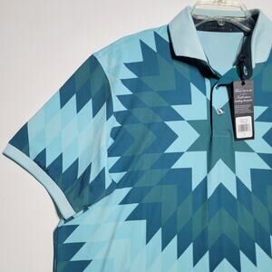 The NWT Greyson Men's Big Sky Polo Shirt in size Large features a bold geometric pattern in shades of blue, perfect for a sporty yet stylish look. Made from a comfortable polyester blend fabric with a light wash, this short sleeve polo is designed for regular fit with a collared neckline. The shirt is easy to care for, lightweight, and offers stretch for added comfort, ideal for golf or any outdoor activity in the summer season. Add a touch of classic style and spirit to your wardrobe with this unique and versatile polo shirt by Greyson.