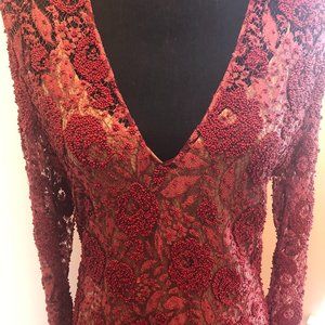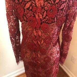 Authentic Gucci dress from the new director of Gucci Alessandro Michele. Sheer red floral lace is completely hand beaded. Long slender sleeves. Eyelash trim at cuff and hem. Nude slip underneath. Low V neck. Zips in back. Made in Italy. Style 409449. Only about 12 of these were made. Very stunning and amazing.