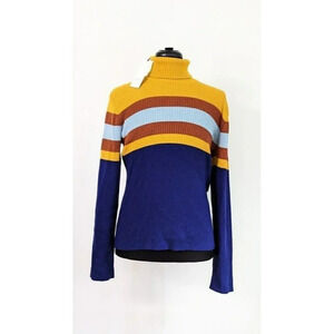 Long sleeve rib knit wool-blend sweater striped in multicolor. Turtleneck collar.
