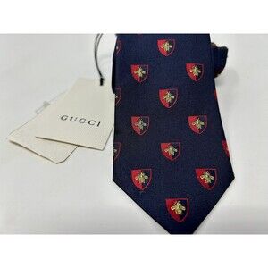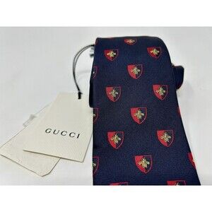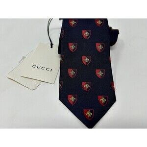 NWT Gucci Navy Gold Bee Logo Icon Shield Crest Pattern Silk Blend Neck Tie $295