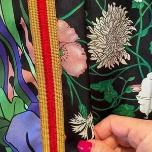 The Gucci Garden Silk Bi-material Harem Trousers in Green is crafted from 100% silk twill in Italy. This harem, loose fitting pair of pants features a garden and tiger head pattern on the front, a black based floral pattern on the back, gold and red embroidered stripes down each side, elastic cuffs and waistband, and a drawstring tie closure.