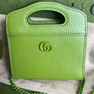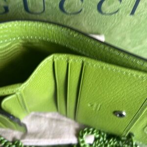 Green leather Gucci marmont GG crossbody card case with cash slot, zippered change compartment and 5 card slots, removable crossbody chain and handles