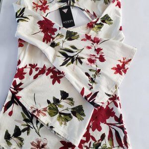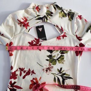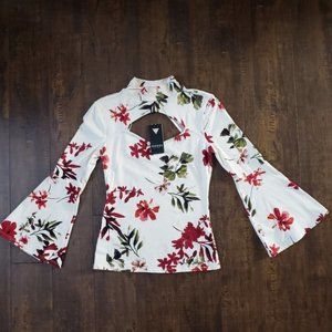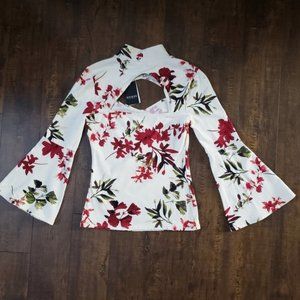 Style: Stretchy, floral top with a cut out in the front and back. Flared Sleeves.