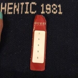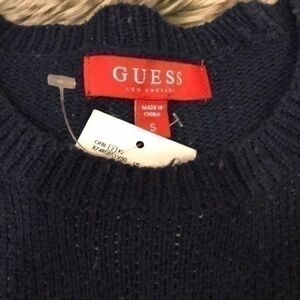 NWT size small guess Jeans sweater. Navy blue. Never worn. Distressed wool sweater. Crew neck. Cream/ tan colored lettering.