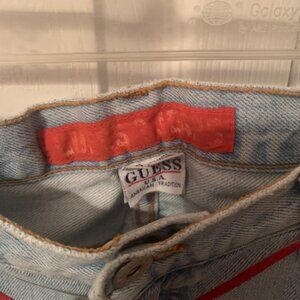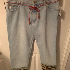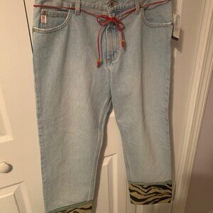 NWT - Women's Guess light blue jeans with suede red sting belt, tan and black zebra cuffs with sequin trim! 30' waist, very unique and outstanding style!