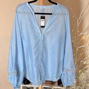 NWT Guess L Silk blend. Light blue,ballon sleeves w/lace trim,covered buttons. Flowy with boho vibes.