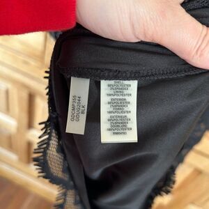 Features: Very cute basic sleeveless dress. Tassle / Lace / Fringe detail all over. Zips at the back. Fairly fitted. Completely lined.