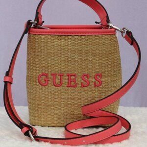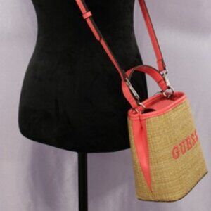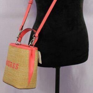 NWT Guess Straw Crossbody Bucket Bag – Coral Pink Trim, Top Handle