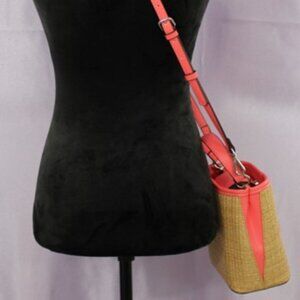 Exterior: Woven straw with coral pink faux leather trim