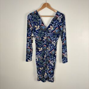 NWT Guess Textured Ruched Bodycon Blue Multicolor Floral V Neck & Back Size 8