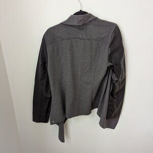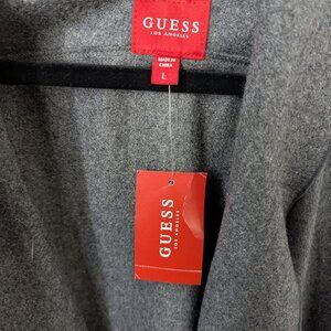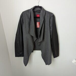Brand new with tags Guess Women's Ahria Wool Blend Drape Open Jacket. Heather gray with faux leather (polyurethane) sleeves. Size large, measuring 22.5 x 30. In perfect new condition.