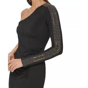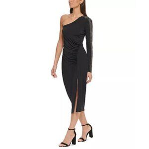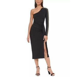 NWT Guess Womens Black One Shoulder Ruched Midi Bodycon Dress Size 10