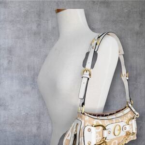Elevate your vintage collection with this stunning Guess Y2K shoulder bag from the early 2000s. The bag features a stylish monogram pattern and a chic bamboo exterior, making it a perfect accessory for any occasion. The medium-sized bag has a zip and magnetic closure for secure storage, and the red lining adds a pop of color to the beige exterior.