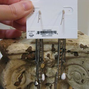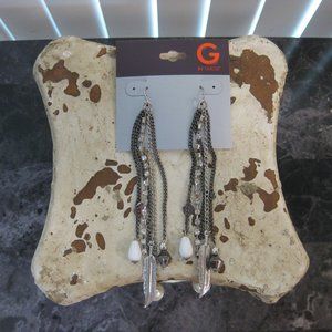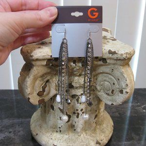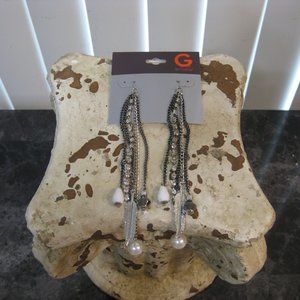 NWT G by Guess silver hematite rhinestone cubic zirconia CZ earrings. Has various charms dangling from chains including feathers, pearls and hearts. Brand new, never worn. Original price: $14.50