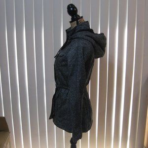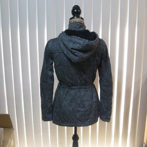 NWT G by Guess gray black white heather marled fall winter anorak style jacket hooded hoodie coat size XS extra small. Full zip up the front secures with snap buttons. Silver hardware. Snap-closure pockets. Drawstring toggle ties at hood and waist allow for a flexible and adjustable fit. Hood is lined with a soft black faux fur. Brand new, never worn. Original price: $69.99