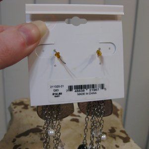 NWT G by Guess silver heart rhinestone chain earrings. The insides of the hearts have kind of a metallic black & silver snakeskin design. Black, clear and pearlized beads along the chains. Silver metal. French hooks. Brand new. Original price: $14.50
