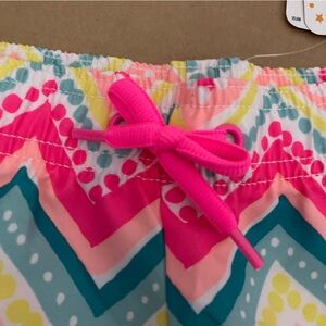 Brand new with tags! Gymboree girls’ swim shorts in size M (7-8). Features a fun and colorful chevron print in pink, blue, and yellow. Elastic waistband with a decorative bow. Perfect for summer, beach, pool days, and vacations.