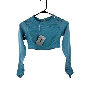 New With Tags Gymshark Flawless Knit Long Sleeve Exercise Crop Top, Color: Sea Blue/Teal. Size Small Features Gymshark branding on sleeves and back, mesh detailing, and thumb holes. Compressive and sweat wicking material. Wicks moisture off your skin to keep you dry, cool and comfortable.