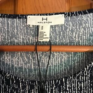 New with Tags! H BY HALSTON dress with a pattern of short white lines on a navy blue background. There’s an attached jacket that ties closed on the left. Pit to pit 20 and length 37 inches.