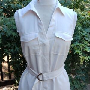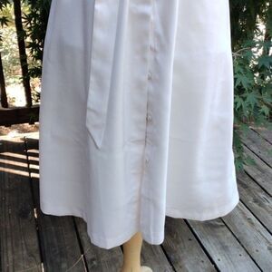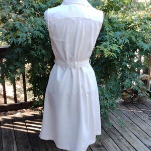 Front hidden buttons. Front pockets. Tie belt. Fine twill fabric. Size 6 measures 38 at chest, 38 at waist, 44 at hips, 39 long from shoulder to hem. Great for work.