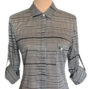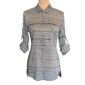 Halston Heritage Button-Up Shirt Blouse in Cream And Dark Brown Geometric Print.