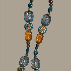 NWT Hand crafted turquoise stone central piece with glass and metal beads. Give your loved one the gift of hand designed jewelry. All of our hand crafted jewelry comes with toggle closures making them arthritis friendly. Necklace is 18” long.