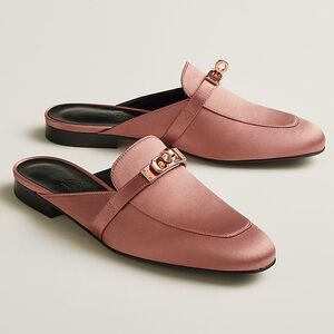 Mules in satin crepe with iconic rose gold-plated Kelly buckle.