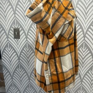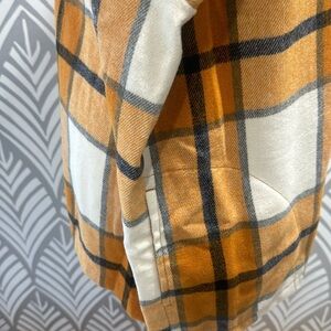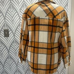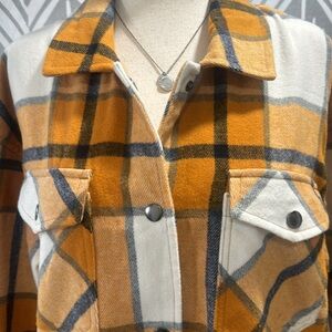NWT HFX ladies shirt jacket. Shades of yellow, mustard, gray and ivory. Snap buttons down the front and on cuffs. Side pockets. Size large. Approximately 26 inches pit to pit. Length measures approximately 29 inches. Open to offers.