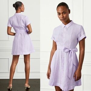 NWT HILL HOUSE Linen Lilac Stripe Short Sleeve Tie Waist Button Up Shirt Dress L