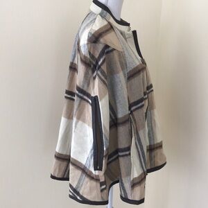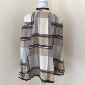 New! H&M size 6 brown plaid poncho style wool blend sweater with pockets and faux leather trim.