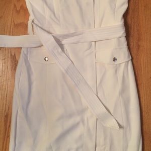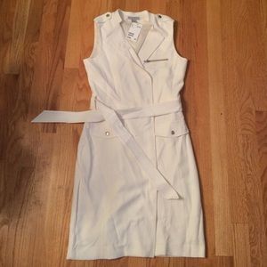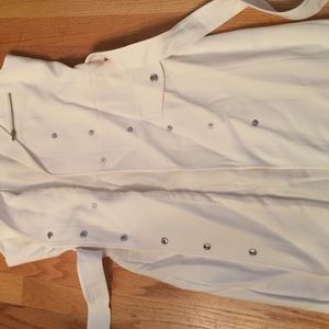 Brand new with tags. Cream color. Silver zipper accents. Looks and feels very expensive. The dress buttons up the front. The last picture is the details of it.