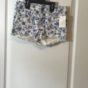 New with tags H&M Divided white shorts with blue floral print. Size 4. The material is 98% cotton and 2% elastane. Measurements: 13.5-inch waist (flat) and 9-inch length.