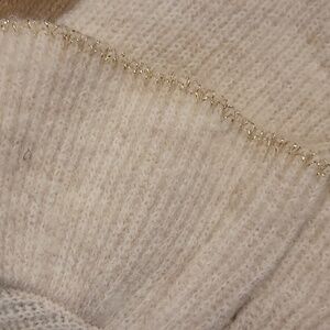 Soft, rib knit with wool for cozy warmth. Flounce ruffle trim, long sleeves and ribbed cuffs. Metallic gold detail at neckline, ruffle trim and cuffs.