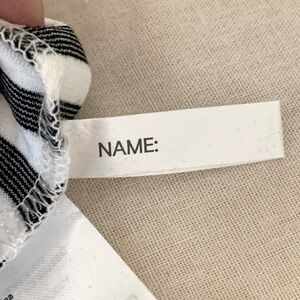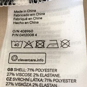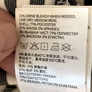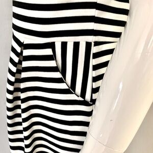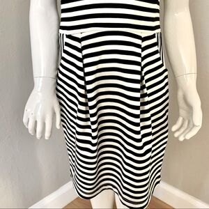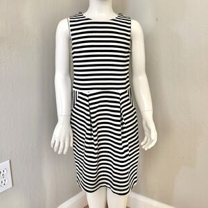 Size 4/6. Brand new with tags. Dark navy blue & cremey white striped knit fabric. 71% Polyester, 27% Viscose, 2% Elastane. Zipper on back. 2 slanted hip pockets. Two pleats on skirt portion of dress. Approximate measurements (taken when laying flat - cannot guarantee fit):