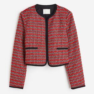 Short jacket in a textured weave with a round neckline, shoulder pads, long sleeves and welt front pockets. No fasteners. Lined.