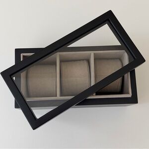Elegant watch box in lacquered medium-density fiberboard with a clear glass lid and soft velvet inside.