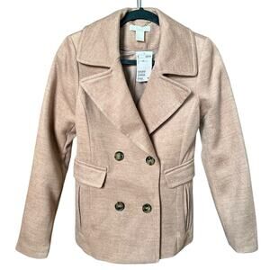 Elegant beige tan pea coat with double-breasted design. Ideal for a polished look.