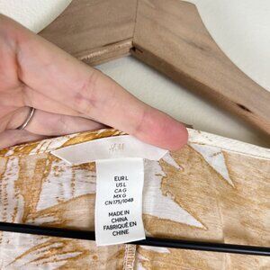 NWT H&M Yellow Palm Printed Long Sleeve Midi Maxi Wrap Dress. Ruffle. Surplice v-neck. Balloon long sleeves with elastic cuffs. True wrap front with tie waist closure. Yellow, cream, beige palm leaf print. Tropical, vacation. Viscose polyamide blend. Size Large. Armpit to armpit: 20". Armpit to end of sleeve: 20". Length: 40.5"-46.5". (665)