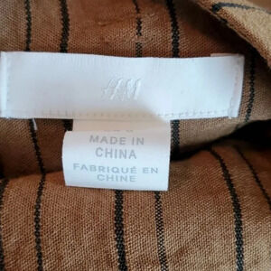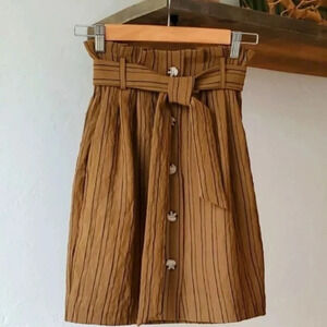 This is a NWT skirt from H&M in a size 0. It's a rust/brown color with black stripes, and a paperbag, tie waist with buttons down the front. It has a hidden side zip closure.