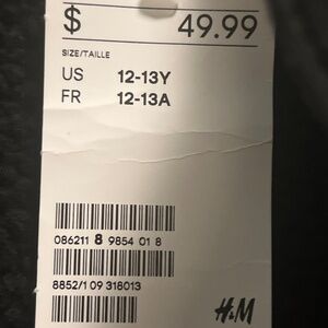 NWT H&M boys size 12-13 , equals about an XS in women’s. Sherpa lining on body, regular polyester lining in sleeve, removable cotton hood.