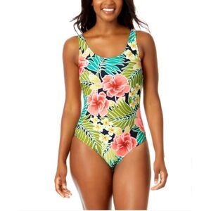 Tags Hawaii Hawaiian Beach Resort vacation pool swim party lounge tan summer camp summertime cute colorful flattering flowers green leaves black background women’s teen girls onepiece one-piece bathing suit multi colored