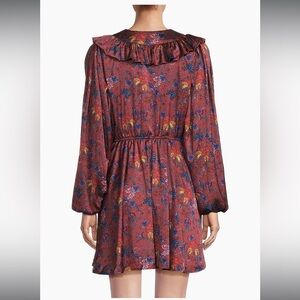 The Tara minidress from Hutch is crafted of floral satin and styled with ruffled trim.