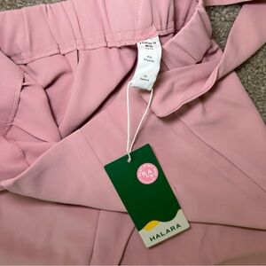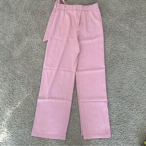 Super cute and comfy high waist led wide left pant with side tie. These pants have a side zipper and an elastic waist band in back. Color is “frost peach pink”