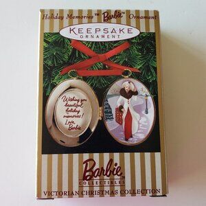 Lockets were very popular in Victorian times and Barbie is pictured inside the locket ornament wearing a burgundy coat with a white fur collar and a white muff is keeping her hands warm. Inside the locket it says, "Inspired by the 1994 Hallmark Exclusive Victorian Elegance Barbie doll."